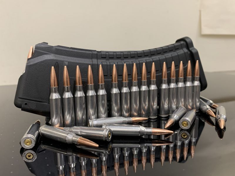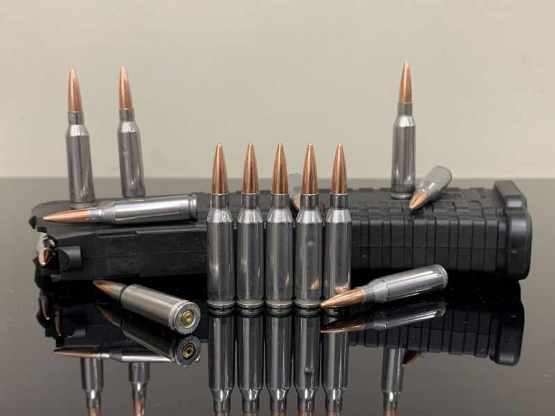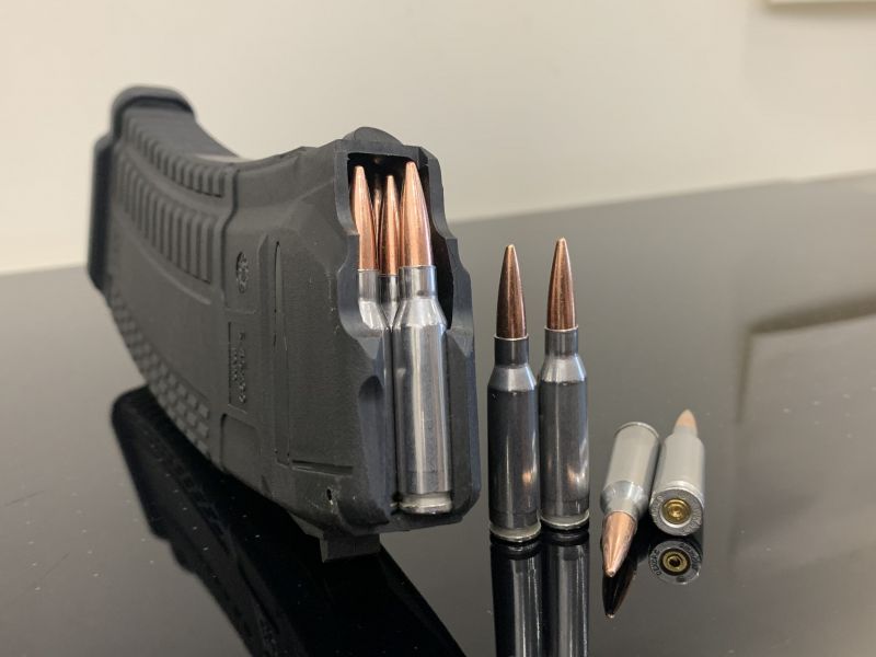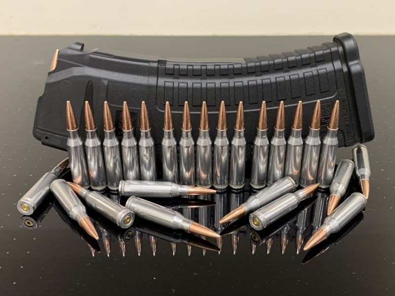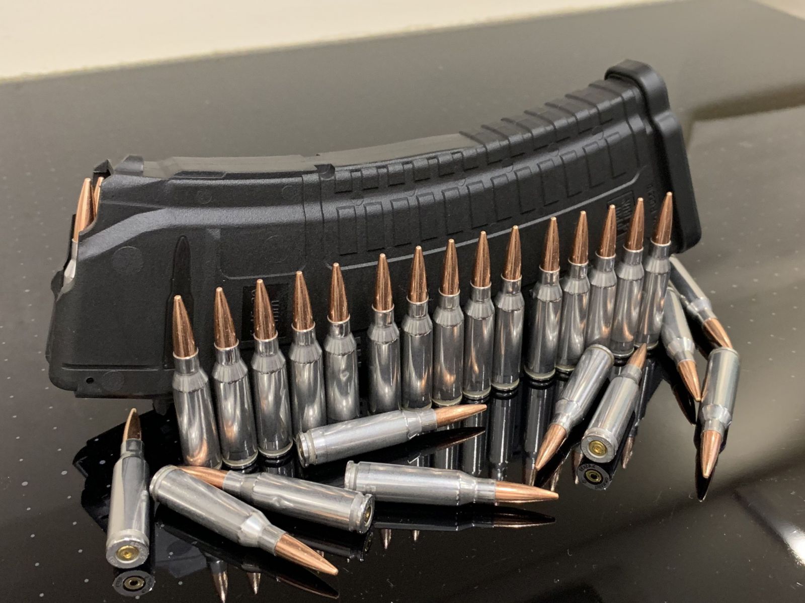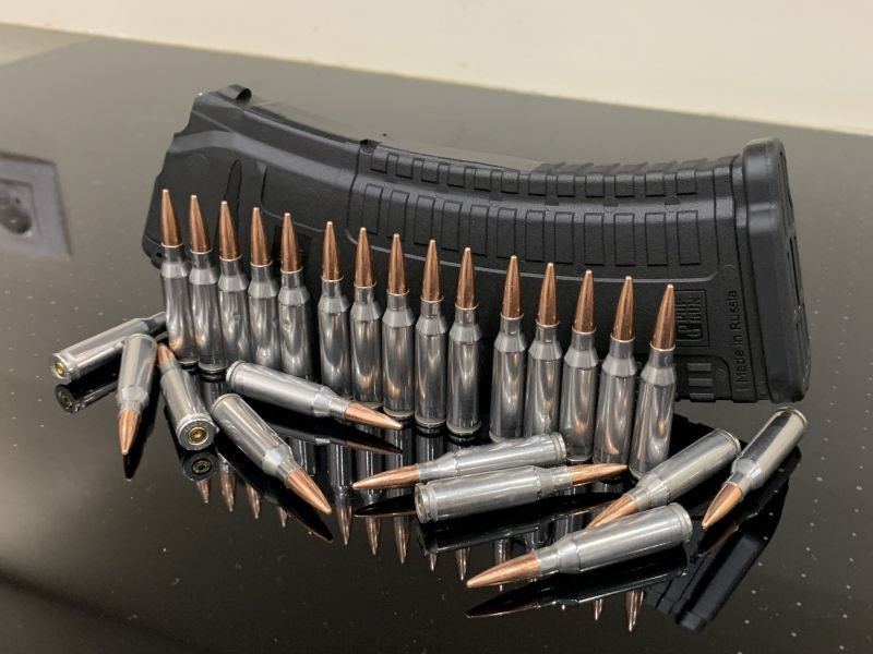Макеты патронов 5.45х39 изготовлены из настоящих гильз и пуль, обжаты на прессе, пули не выпадают и не проваливаются при многократном использовании.