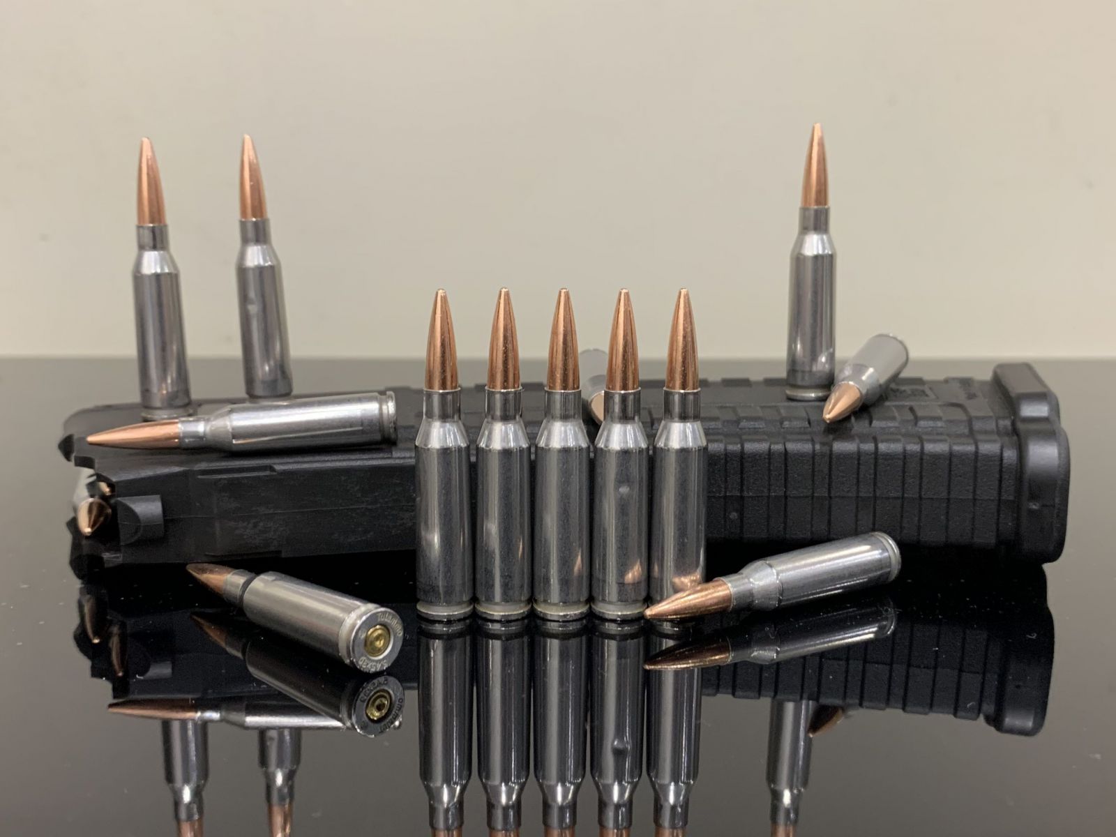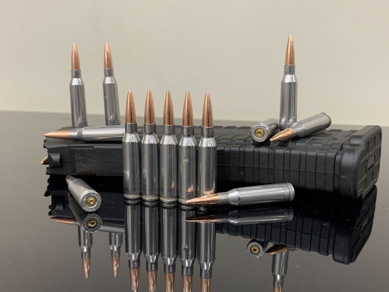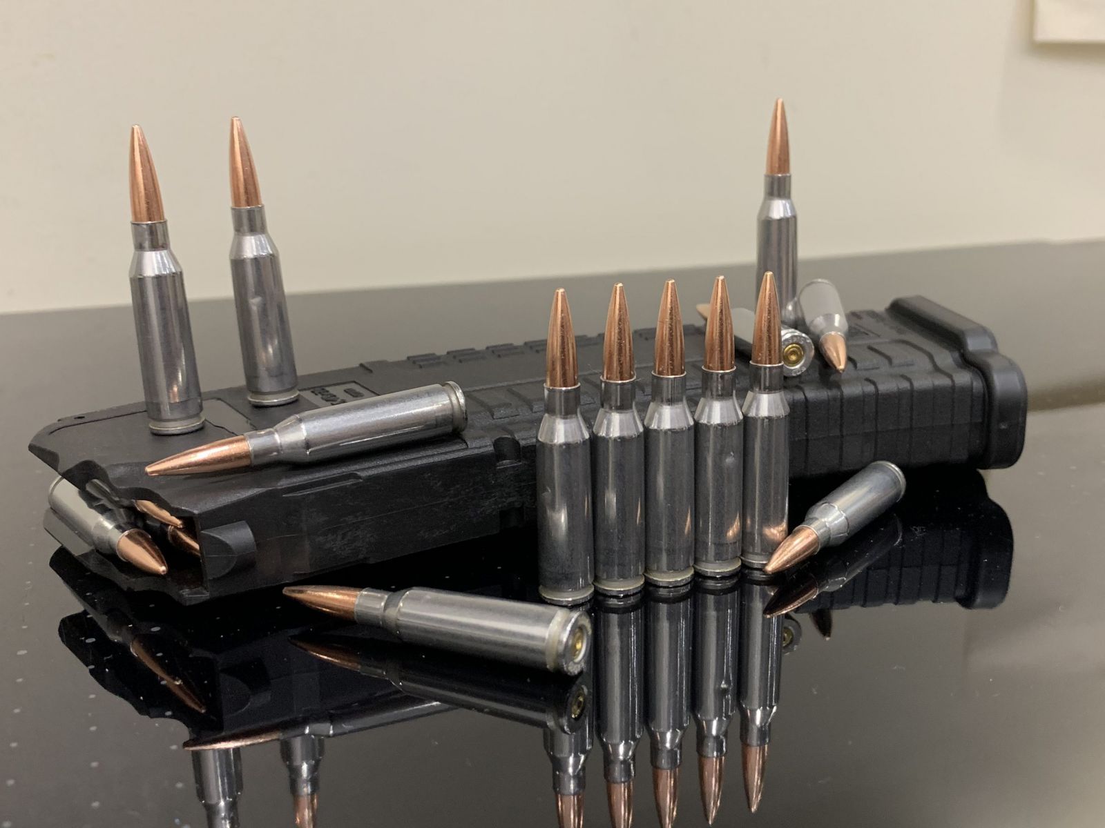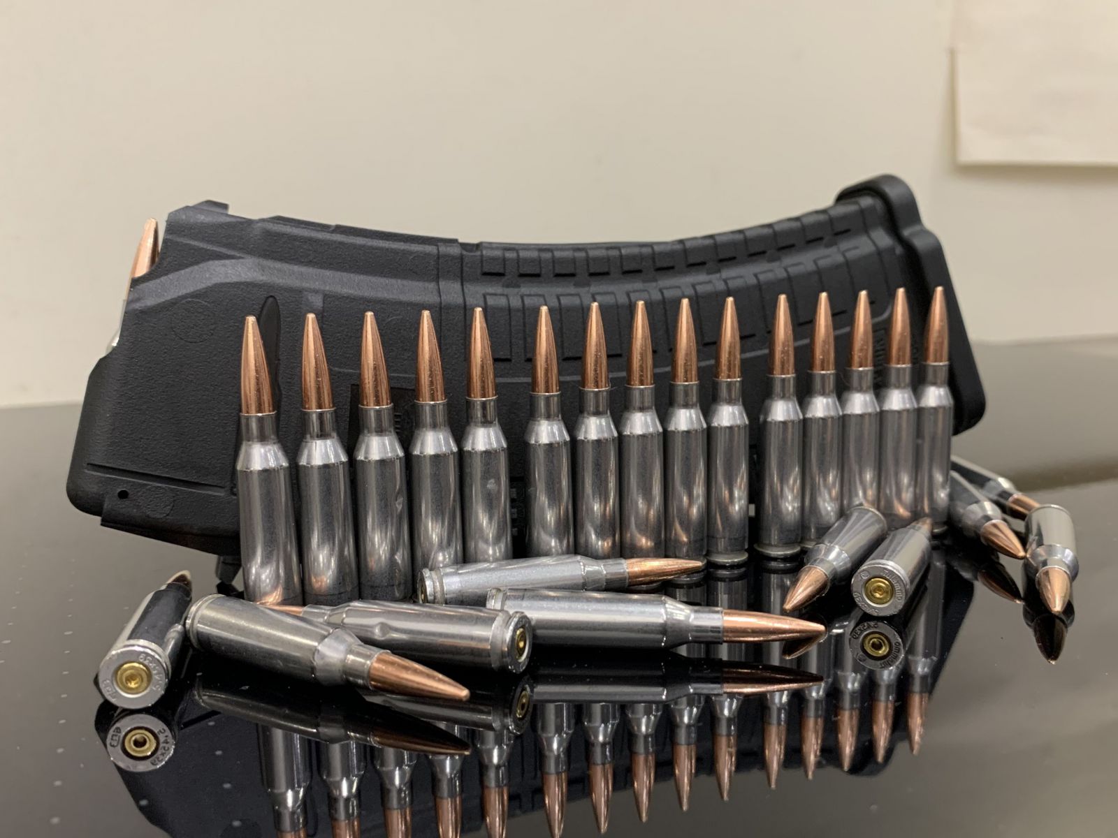 - Стальной и блестящий хорошо виден в смеси зеленых / серых боевых патронов и гильз