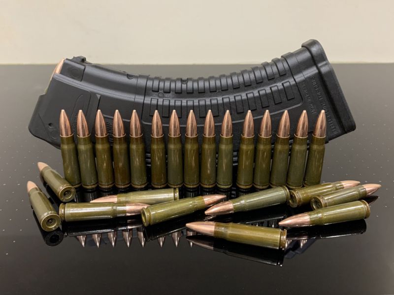 Макеты патронов 7.62х39 изготовлены из настоящих гильз и пуль, обжаты на прессе, пули не выпадают и не проваливаются при многократном использовании.