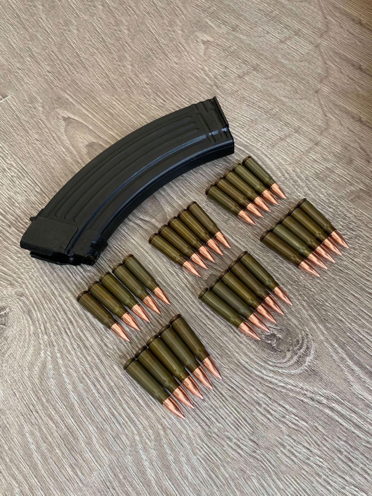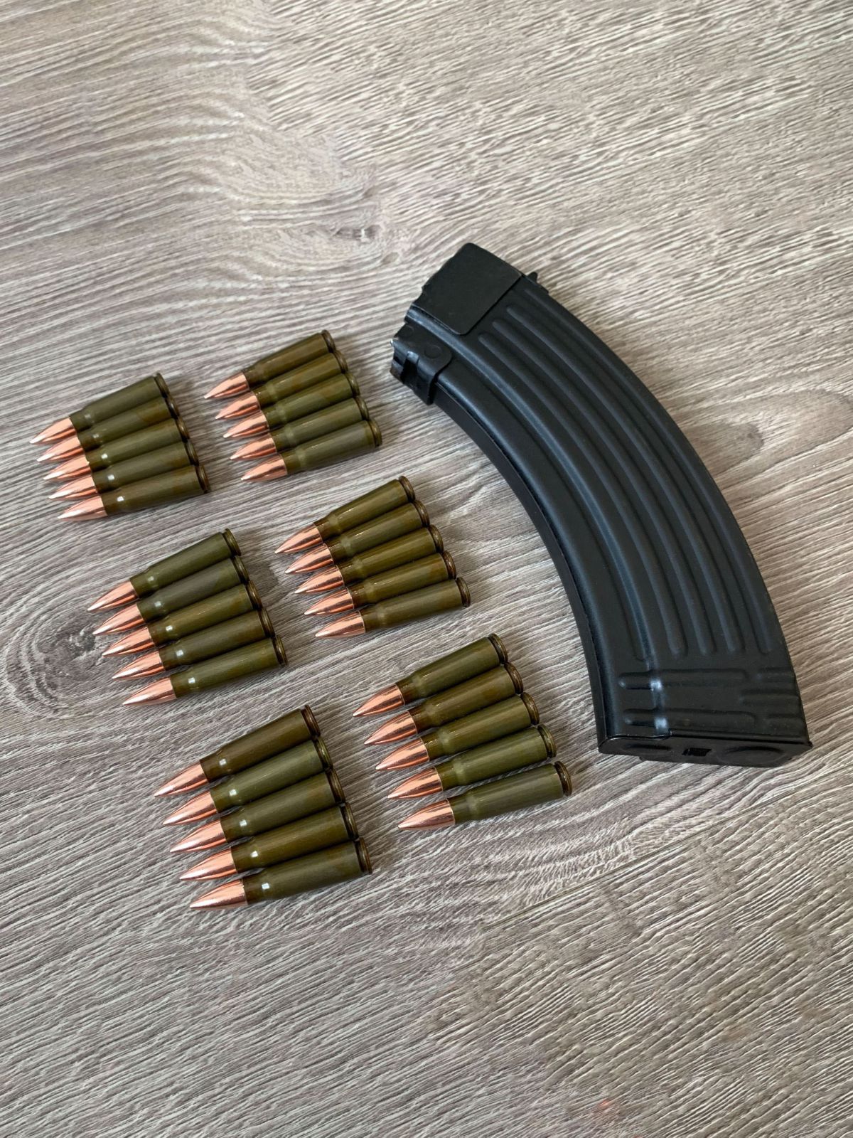Макеты патронов 7.62х39 изготовлены из настоящих гильз и пуль, обжаты на прессе, пули не выпадают и не проваливаются при многократном использовании.